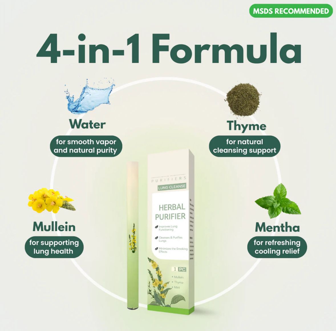 It's a plant-powered solution designed to support your body naturally. By delivering the soothing benefits of Mullein, Thyme, Water and Mint, it works to cleanse and purify your lungs while minimizing the harsh effects of smoking.